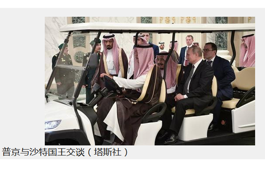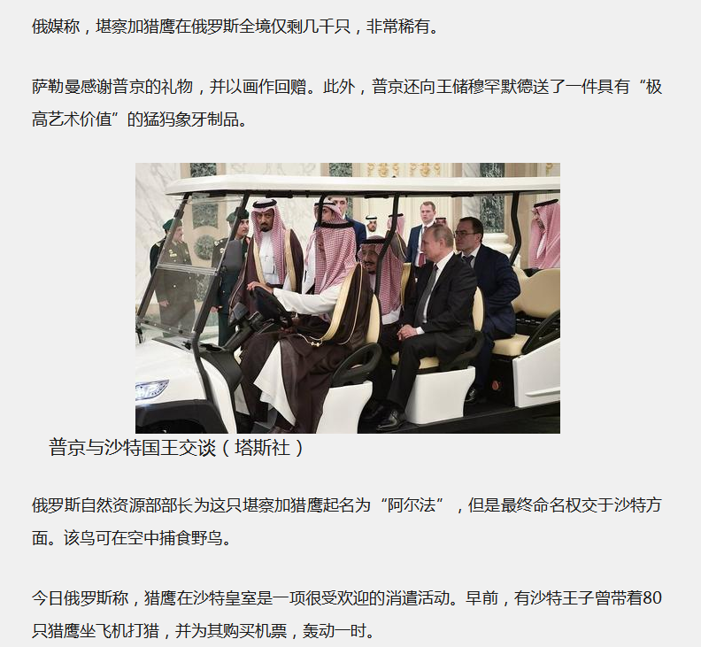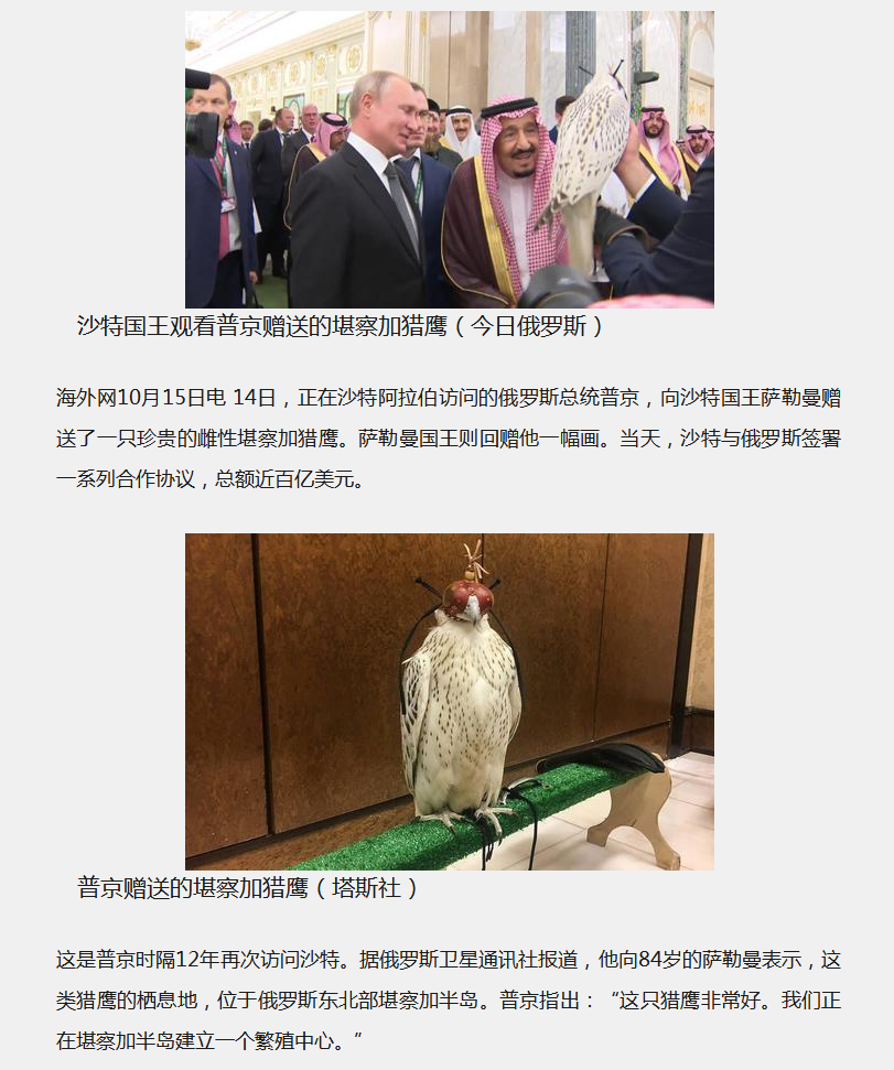 海外網(wǎng)10月15日電 14日,俄羅斯總統(tǒng)普京向沙特國王薩勒曼贈送了一只珍貴的雌性堪察加獵鷹。薩勒曼國王則回贈他一幅畫。當(dāng)天,沙特與俄羅斯簽署一系列合作協(xié)議,總額近百億美元。而我們的卓越電動車正好見證了這樣的歷史時刻。 圖中俄羅斯總統(tǒng)普京和沙特國王坐在卓越電動車上。