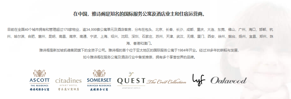 在中國(guó),雅詩(shī)閣是知名的國(guó)際服務(wù)公寓及酒店業(yè)主和住宿運(yùn)營(yíng)商。目前在全國(guó)40個(gè)城市擁有和管理超過170家物業(yè),逾34,000套公寓單元及酒店客房。